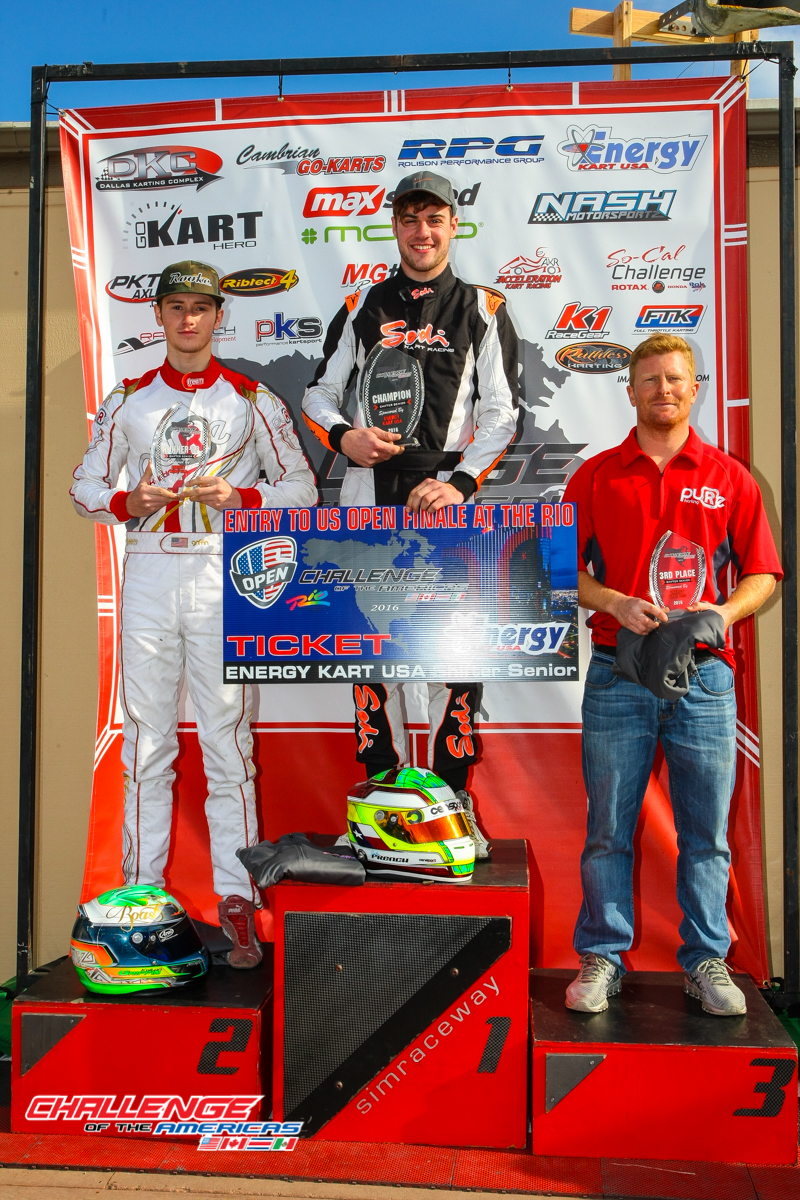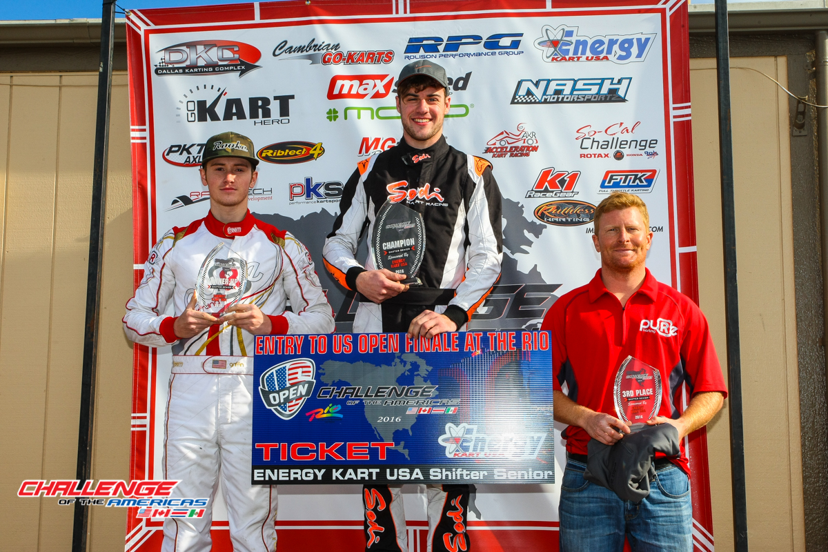 2019 Challenge of the Americas Champions. Junior Rok – William Ferguson, Mini Rok – Enzo Deligny, Shifter Masters Rok – Rod Clinard, Senior Rok – Cooper Becklin, 100cc Masters Jimmy Gregory, Senior Shifter Rok – Ron White, 100cc Senior – Colby DuBato, Masters Rok – Derek Wang, Micro Rok – Filippo Sala