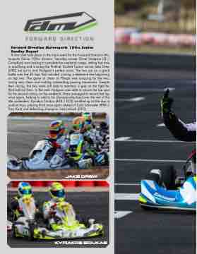 torsports Senior 100cc division. Saturday winner Oliver Hodgson (J3 / CompKart) was looking to complete the weekend sweep, setting fast time in qualifying and winning the Prefinal. Double Tucson winner Jake Drew (GFC) set out to end Hodgson’s perfect score. The two put on a great battle over the 20 laps that included running a defensive line beginning on lap two. The game of chess at 70mph was amazing by the two, racing very clean and making outstanding passing maneuvers. Despite their racing, the two were still able to maintain a gap on the fight for third behind them. In the end, Hodgson was able to secure the top spot for his second victory on the weekend. Drew managed to record fast lap once again, helping to add to his championship lead over the rest of the title contenders. Kyriakos Sioukas (AKR / EOS) doubled up on the day in podium trips, placing third once again ahead of Cole Schroeder (RPM / Tony Kart) and defending champion Liam Letzsch (GFC).